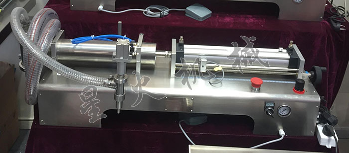灌裝機為半自動活塞式灌裝機。通過氣缸帶動一個活塞來抽取和打出物料用單向閥控制物料流向,用磁簧開關控制氣缸的行程,即可調節(jié)灌裝量。